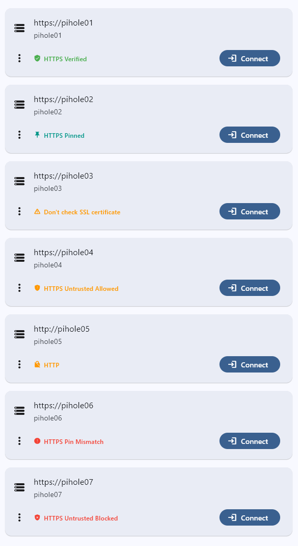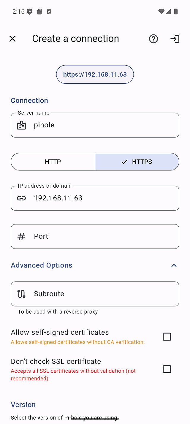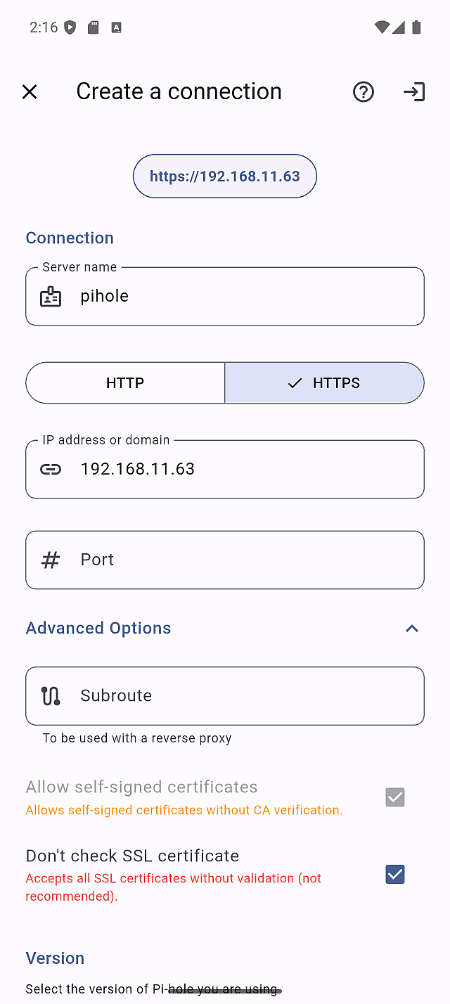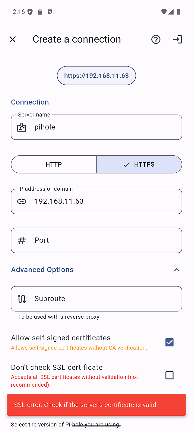 If you're running Pi-hole in Docker, you may encounter connection issues even with "Allow self-signed certificates" enabled.