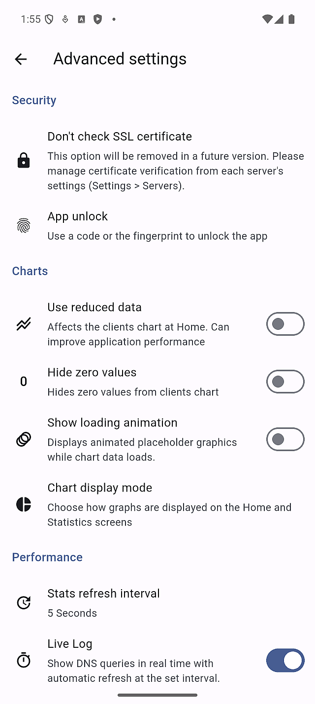 App Settings control how the Pi-hole Client app behaves on your device. These settings do not change Pi-hole itself, but they affect how information is displayed, how often data refreshes, and how the app feels to use.