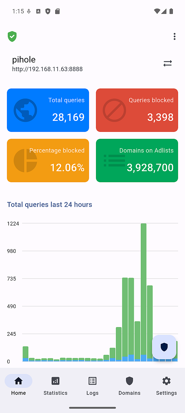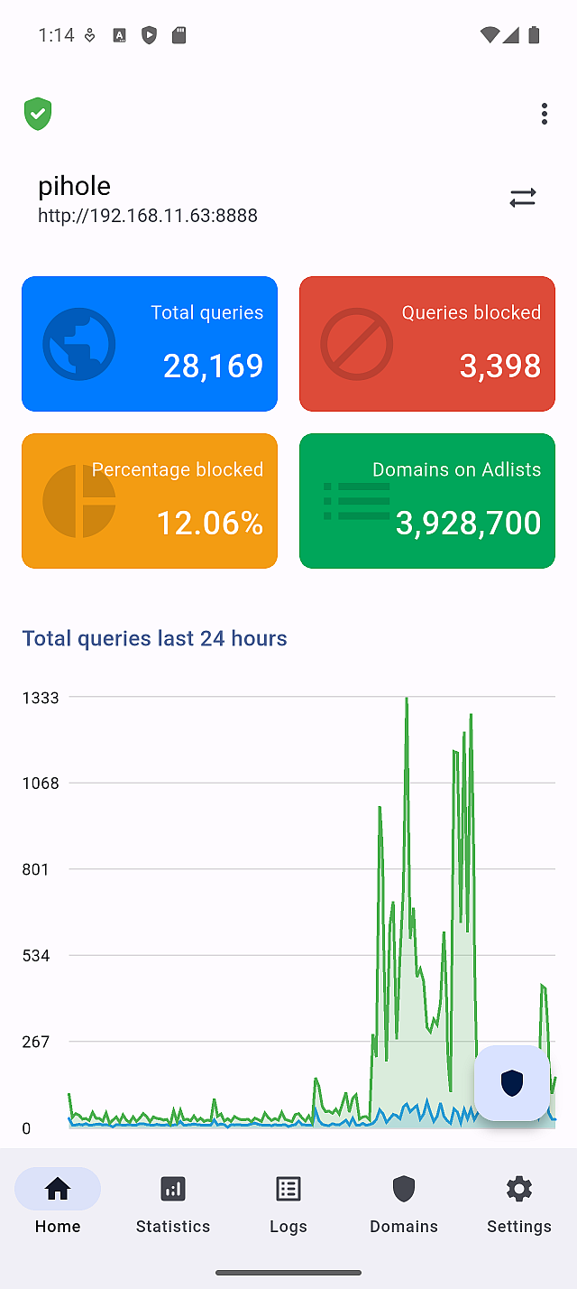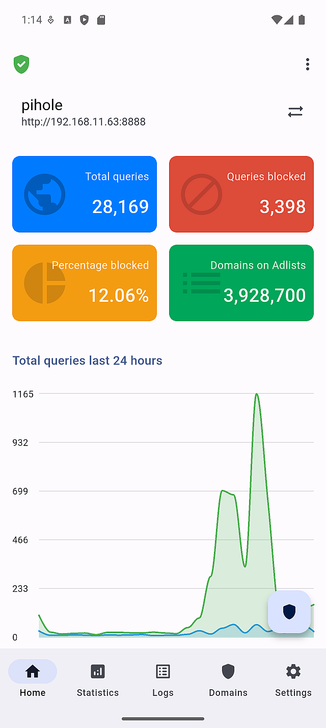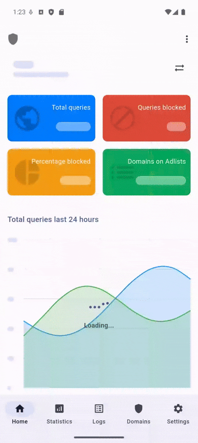 The summary tiles include values such as total queries and blocked percentage. On the Statistics screen, this interval determines how frequently Domains and Clients data is updated.
