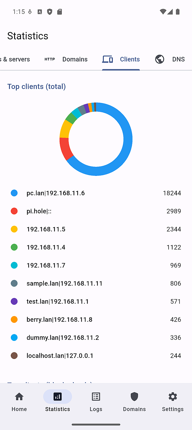 - Data shown on the Statistics screen, including Domains and Clients